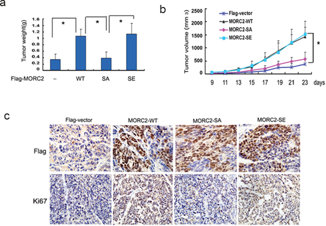 As shown in Figure 4A and 4B, nude mice injected with MORC2-WT or MORC2-SE SGC-7901 cells developed markedly heavier tumor weight and larger volume than vector control and MORC2-SA group. After that, we performed immunohistochemical analysis to verify the formation of xenografts tumor with anti-Flag staining in nude mice (Figure 4C, upper panel). Concurrently, accelerated proliferation was revealed Ki67 staining performed in xenografts tumor sections (Figure 4C, down panel). Taken together, MORC2 phosphorylation contributes to tumorigenesis of gastric cancer cells.