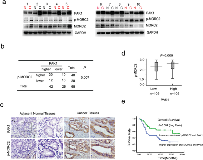 After that, immunohistochemical staining for PAK1 and p-MORC2 was also performed using sequential sections from the same tissue, which indicated that the expression level of p-MORC2 by immunohistochemistry are correlated with that by western blotting. Representative samples were shown in Figure 5C. To better understand the correlation between them, we divided tumor samples into two groups on the basis of PAK1 amounts (cut off at the median score), and studied the differences of p-MORC2 expression with clinical gastric cancer. The data showed the expression scores of p-MORC2 in tumors were consistent with PAK1 scores (p = 0.009; Figure 5D), and the high expression scores of PAK1 and phosphorylated MORC2 in clinical gastric cancer were also found to predict shorter overall survival of patients Log Rank p = 0.004, Figure 5E), suggesting that phosphorylation of MORC2 appears to be associated with the poor prognosis of clinical gastric cancer.