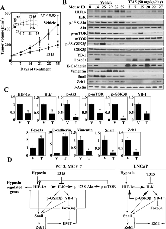 Figure 7: Effect of ILK inhibition by treatment with T315 on PC-3 xenograft tumors. (A) Effect of T315 (p.o., 50 mg/kg, once daily) on PC-3 tumor growth in nude mice (n = 8). Inset, average body weights of each treatment group during the study. Data are presented as means ± S.E. (*p < 0.05 compared to vehicle). (B & C) Western blot analysis of the phosphorylation/expression levels of relevant markers in six representative tumors from each treatment group. (B) Immunoblots. (C) Relative expression levels of the various markers based on densitometric quantitation of band intensities. Data are presented as means ± SD (*p < 0.05 compared to vehicle). T, T315; V, vehicle. (D) Diagrams depicting the mechanisms by which ILK inhibition regulates HIF-1α expression and reverses the mesenchymal phenotype of cancer cells under hypoxic conditions.