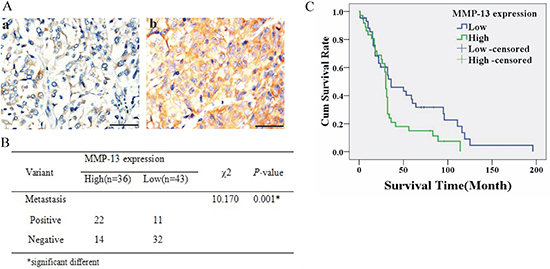 Figure 1: Higher MMP-13 expression (MMP-13high) was associated with metastasis and poorer survival of melanoma patients. (A) Representative IHC-stained images of human melanoma tissues with low (a) or high (b) MMP-13 expression. (B) Melanoma with MMP-13high tumor cells has higher metastatic rates than MMP-13low tumors. *P < 0.05. (C) Kaplan–Meier survival curve for melanoma patients; the MMP-13high group had a poorer survival rate (P = 0.041; bar: 50 μm).