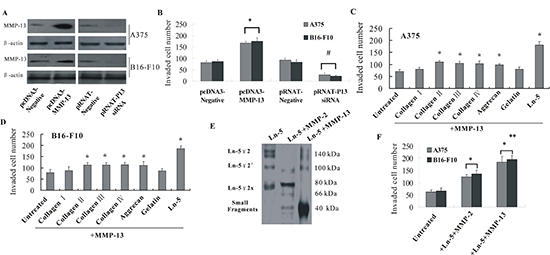 Figure 2: MMP-13 promoted invasion of melanoma cells and cleaved Ln-5 into small molecular weight fragments. (A) Transfection efficiency was confirmed by western blotting. (B) Upregulated or knocked-down MMP-13 expression in A375 or B16-F10 melanoma cells promoted or decreased (respectively) invasion of tumor cells through Matrigel-coated transwell membranes. *P < 0.05, compared with the pcDNA3.1 empty vector control; #P < 0.05, compared with pRNAT−control. (C and D) Invasiveness of different ECM substrates cleaved by MMP-13. A375 and B16-F10 melanoma cells were incubated for 24 h with products of collagen I, II, III, IV, aggrecan, gelatin or laminin-5 cleaved by MMP-13, and their invasion abilities through Matrigel were measured. Compared with untreated controls, the MMP-13 cleavage products of collagen II, III, IV, aggrecan or laminin-5 all increased invasiveness of the two melanoma cell lines. However, 3× as many cells incubated with the Ln-5, and 2× as many cells incubated with collagen II, III, IV and aggrecan cleavage products invaded the transwell membrane than untreated cells, which suggests the important role of Ln-5–MMP-13 cleavage fragments in melanoma invasiveness. *P < 0.05 compared with untreated control. (E) Cleavage fragments of human Ln-5γ2 by MMP-2 or MMP-13 at 37°C for 6 h were run on 12% SDS-PAGE gel and detected by western blot using an anti-human Ln-5γ2-chain antibody. The left lane shows intact Ln-5γ2-chain in 140- and 100-kDa forms. MMP-2 generated an 80-kDa Ln-5γ2x fragment and very faint 66-kDa fragment. MMP-13 further generated low molecular weight fragments of ~40 kDa. (F) Adding MMP-13–LN-5 cleavage fragments to the cell culture medium induced melanoma cells to be significantly more invasive than untreated cells and cells treated with MMP-2–Ln-5 fragments. *P < 0.05, compared with untreated controls; **P < 0.05, compared with cells treated with MMP-2–Ln-5 fragments. All of the experiments were repeated three times.