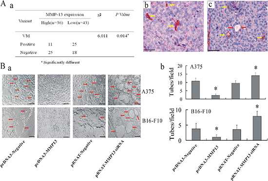 Figure 3: MMP-13 inhibited formation of VM both in vivo and in vitro. (A) (a) Significantly less VM can be seen in MMP-13high human melanoma samples than in MMP-13low samples. *P < 0.05. (b) and (c) show representative images of VM in human melanoma tissues with MMP-13low (b) or MMP-13high (c) tumor cells (CD31/PAS double-staining). Yellow arrow in (b) shows endothelial-dependent vessel is CD31+ and PAS-positive. *P < 0.05. (c) VM channel formed by tumor cells was CD31−whereas base membrane-like structure between red blood cells and tumor cells PAS-positive (red arrow). Yellow arrow: endothelial-dependent vessel is CD31+ and PAS-positive. Bar: 50 μm. (B) Transfection with pcDNA3-MMP-13 abrogated formation of capillary-like tubes in melanoma cells on Matrigel. However, MMP-13 knockdown induced typical vessel-like tube formation. (a) Representative images of tube formation in melanoma cells with varying MMP-13 levels. Bar: 100 μm. (b) Quantitative analysis of tubes formed by melanoma cells under different conditions.