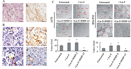 Figure 4: Laminin affects VM formation in human melanoma in vivo and MMP-13–Ln-5 cleavage fragments disrupt VM formation in vitro. (A) Dimensional relationship of the PAS-positive patterns and laminin expression in human melanoma. (a) In PAS-stained melanoma tissue sections (without nuclear counterstain), PAS-positive interconnected back-to-back loops and patterns were visible and formed networks (arrow-heads). (b) Anti-laminin immunostaining of human melanoma tissues showed laminin-positive loops and networks similar to the PAS-positive patterns. Bar: 100 μm. (B) Dimensional relationship of the VM channels and laminin expression in human melanoma. (a) and (c): CD31/PAS double staining. Black arrows: Vasculogenic mimicry channels in which PAS-positive materials and red blood cells can be seen. Yellow arrow: blood vessels lined by endothelial cells. (b) and (d): Laminin IHC staining. Black arrow: Patterns of laminin-positive cells are not lined by endothelial cells but are in direct contact with melanoma cells. Bar: 50 μm. (C) Exogenous addition of MMP-13–Ln-5 cleavage products to 3-D culture medium decreased formation of capillary-like tubes by A375 and B16-F10 melanoma cells, whereas adding Ln-5 or MMP-2–Ln-5 cleavage products formation of more typical capillary-like and ECM-rich tubes on Matrigel. Red arrows: vessel-like tubes formed by melanoma cells. *P < 0.05, bar: 100 μm.