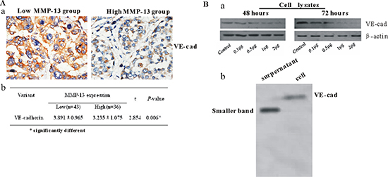 Figure 5: MMP-13 decreases expression of VE-cadherin both in vivo and in vitro. (A) (a) Representative IHC stained images of VE-cadherin in human melanoma tissues with low or high MMP-13 expression.VE-cadherin staining can be seen in both membrane and cytoplasm of tumor cells. Bar: 50 μm. (b) Staining index of VE-cadherin in melanoma tissues with high or low MMP-13 expression (mean ± SD). *P < 0.05. (B) (a) Different concentration of MMP-13 added to culture medium of A375 for 48 h or 72 h induced dose-dependent decreases in VE-cadherin levels. (b) Western blot analysis of cell lysates and culture medium of A375 stimulated by human recombinant active MMP-13(2 μg/ml) for 72 h, using anti-human-VE-cadherin antibody. Cell lane shows relatively faint band of VE-cadherin at 115 kDa; supernatant lane shows smaller band of VE-cadherin in the culture medium.