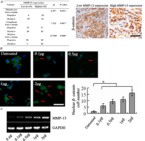 Figure 6: MMP-13 induces nuclear translocation of β-catenin. (A) Left panel: higher β-catenin+ levels in cytoplasm and nucleus are seen in melanoma tissues with high MMP-13 expression than in those with low MMP-13 expression. *P < 0.05, bar: 100 μm. (B) β-catenin immunofluorescence staining shows that adding MMP-13 to A375 cell culture medium induces dose-dependent nuclear translocation of β-catenin, from cell membranes in the untreated control group. Number of tumor cells with positive nuclear staining (red arrow) varies with MMP-13 concentration, which is most obvious at 2 μg/ml. *P < 0.05, compared with untreated controls (n = 3). Bar: 50 μm. (C) After 72 h stimulation with exogenous MMP-13, A375 melanoma cells show dose-dependent increase in MMP-13 mRNA.
