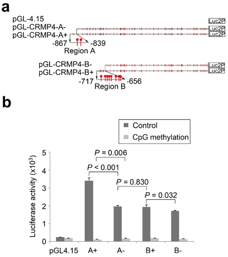 Figure 1: Regulation of CRMP4 promoter activity by CpG modification. (a) Illustration of the four CRMP4 promoter-driven luciferase reporters designated as A+ (−867/+114), A− (−839/+114), B+ (−717/+114), and B− (−656/+114). (b) Luciferase activities of the four CRMP4 promoter reporters that were pre-treated with or without M.SssI. One-way ANOVA was used to analyze the difference among the four groups luciferase reporters designated, and the differences between groups determined by the Student’s t-test were considered to be significant at a P value less than 0.05/3 after correction. The error bars in b are s.e.m.