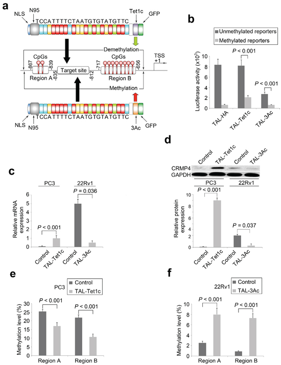 Figure 2: Locus-specific modulation of CRMP4 expression by dTALEs. (a) Illustration of the dTALEs. The synthetic TALE DNA-binding domain, the 23 bp targeting sequence from CRMP4 promoter region, nuclear localization signal (NLS), the truncated N-terminal domain (N95), the catalytic domain of Tet1 (Tet1c), the catalytic domain of DNMT3A (3Ac), and the other functional domain such as GFP are shown. The CRMP4 promoter structure (middle panel of Figure 2a) is drawn on a non-proportional scale. TSS: translation start site. (b) Luciferase activities altered by dTALEs through locus-specific CpG modification. Co-transfections with dTALEs and the CpG-free CRMP4-pCpGL reporter pre-treated with and without M.SssI were performed in HEK293 and COS-1 cells. (c) Alteration of endogenous CRMP4 mRNA expression in prostate cancer cells detected using qRT-PCR. The PC3 and 22Rv1 cells were transfected with CRMP4-TAL-3Ac, CRMP4-TAL-Tet1c, and empty phCMV1 vector to induce locus-specific CpG modifications. (d) Alteration of endogenous CRMP4 protein expression in prostate cancer cells detected using Western blotting. The prostate cancer cells were treated as described for Figure 3c. (e) CpG methylation frequencies of CRMP4 promoter Region A and Region B detected in the PC3 cells using pyrosequencing. The PC3 cells were transfected with CRMP4-TAL-Tet1c or empty phCMV1 vector as control. (f) CpG methylation frequencies of CRMP4 promoter Region A and Region B detected in the 22Rv1 cells using pyrosequencing. The 22Rv1 cells were transfected with CRMP4-TAL-3Ac or empty phCMV1 vector as control. The P values in b–f were determined with the Student’s t-test. The error bars in b–f are s.e.m.