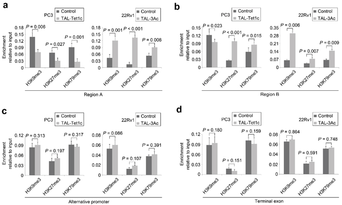 Figure 3: Histone modifications in the PCa cells expressing dTALEs. Ectopic expression of CRMP4-TAL-Tet1c in PC3 cells and CRMP4-TAL-3Ac in 22Rv1 cells induced the histone modifications at H3K9me3, H3K27me3 and H3K79me3 in (a) CRMP4 promoter Region A (−867/−839), (b) CRMP4 promoter Region B (−717/−656), (c) CRMP4 alternative promoter located 56 kb to the 5’ of the start codon, (d) CRMP4 terminal exon located 60 kb to the 3’ of the start codon. Empty phCMV1 vector was transfected in PC3 and 22Rv1 cells as controls. CRMP4 gene is located in chromosome 5. The P values in a–d were determined with the Student’s t-test. The error bars in a–d are s.e.m.