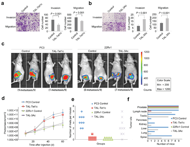 To determine whether the locus-specific epigenomic modifications are necessary and sufficient to transform tumor progression in vitro and in vivo, the metastatic PC3 cells expressing CRMP4-TAL-Tet1c and the non-metastatic 22Rv1 cells expressing CRMP4-TAL-3Ac were examined for tissue invasive and cell migratory activities. Figure 4a shows that CRMP4-TAL-Tet1c significantly reduced tissue invasion and migration of PC3 cells. Figure 4b shows that CRMP4-TAL-3Ac induced significant tissue invasion and migration of 22Rv1 cells.