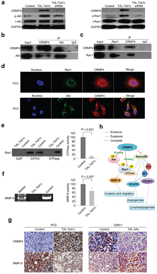 Figure 5: Akt-Rac1-MMP9 signaling pathway in CRMP4-mediated suppression of metastasis. (a) Western blot detection of phosphorylation and expression of Akt and Rac1 in the PC3 cells transfected with CRMP4-TAL-Tet1c or empty vector phCMV1 as control. CRMP4 siRNA was utilized to verify the loss-of-function. (b) Akt and CRMP4 interaction detected in the PC3 cells with differential Co-IP and Western blot. (c) Rac1 and CRMP4 interaction detected in the PC3 cells with differential Co-IP and Western blot. (d) Subcellular co-localization of CRMP4 with Akt and Rac1, respectively, in the CRMP4-TAL-Tet1c-expressing PC3 cells detected using confocal images. (e) Rac1 GTPase activity detected in the CRMP4-TAL-Tet1c-expressing PC3 cells using a Pull-down assay. (f) MMP-9 activity detected in the CRMP4-TAL-Tet1c-expressing PC3 cells using a Gelatin zymography assay. (g) IHC detection of opposite expression of CRMP4 and MMP-9 in the primary tumors from mice injected with PC3 or 22Rv1 cells expressing specified dTALEs. (h) Schematic of CRMP4-mediated signaling pathway involving phosphorylation of Akt and Rac1, activity of Rac1 GTPase and MMP-9, and repressed expression of MMP-9, VEGFB and VEGFC15, collectively leading to suppression of prostate cancer metastasis (Solid-lines: findings of this manuscript. Dashed-lines: previously published data and data not shown). The P values in e and f were determined with the Student’s t-test. The error bars in e and f are s.e.m.