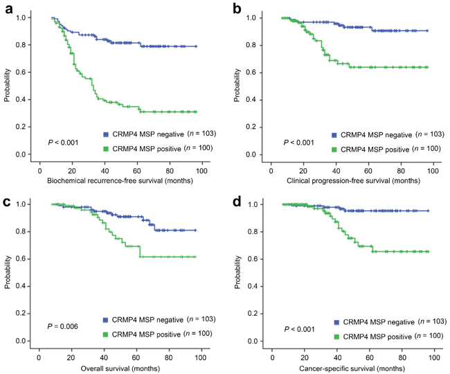 Figure 6: Differential survival of prostate cancer patients with positive and negative CRMP4 CpG methylation. (a–d) Kaplan–Meier graphs representing the probability of cumulative (a) biochemical recurrence-free survival, (b) clinical progression-free (free of a biopsy-proven local recurrence or imaging-identified systemic metastasis lesions) survival, (c) overall survival and (d) prostate cancer-specific survival in prostate cancer patients stratified according to positive and negative CRMP4 CpG methylation status in their primary tumors. The log-rank test P value reflects the significance of the correlation between CRMP4 CpG methylation and survival outcome. MSP: methylation-specific PCR.