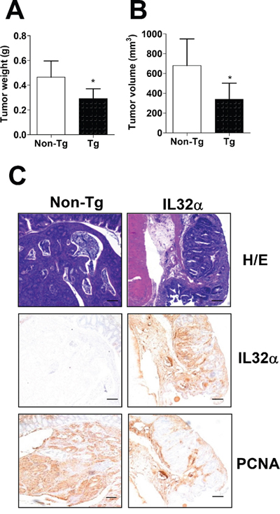 Figure 1: Inhibition of cancer development in IL-32α Tg mice. (A, B) 7-week-old non-Tg and IL-32α-Tg mice were injected intraperitoneally with 10 mg/kg of AOM once a week for 6 weeks. Mice were killed at 32 weeks after AOM injections. Colons were harvested and Tumor weight (A) and volume (B) were monitored. (C) Colon tissues were processed and stained with H&E or analyzed by immunohistochemistry for detection of positive cells for IL-32α and PCNA. The images are representative of three separate experiments performed in triplicate. Scale bars indicate 100 μm. *Significant difference from non-Tg mice (*p < 0.05).