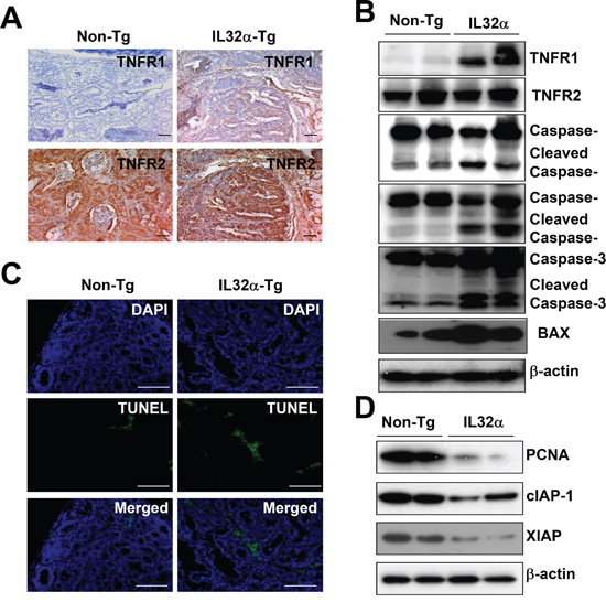 Figure 2: Expression of TNFR1 and cell death in colon cancer tissues of IL-32α Tg mice. (A) TNFR1 and TNFR2 were observed by immunohistochemical analysis as described in Materials and Methods. (B) The expression of TNFR1, TNFR2, apoptotic proteins were detected by Western blotting using specific antibodies in tumor tissue extracts. β-actin protein was used as an loading control. (C) Apoptotic cells were examined by TUNEL staining. (D) Cancer extracts were analyzed by Western blotting as described in Materials and Methods section. Each images and band are representative of three independent mice.
