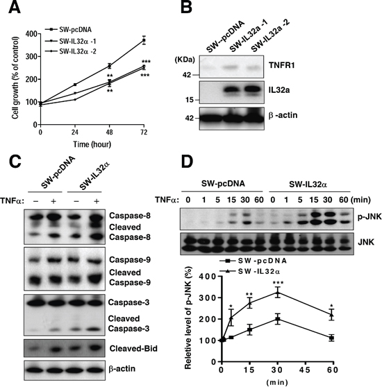 Figure 3: Effects of stable expression of IL-32α in SW620 cells on colon cancer cell growth and apoptotic signaling. (A) SW620 cells were stably transfected with either the empty pcDNA3.1 vector (SW-pcDNA cells) or the IL-32α expression vector (SW-IL-32α cells), respectively. Cell growth rate was measured by MTT assay during 72 hr (B) Expression of IL-32α and TNFR1 is shown by Western blot analysis. β-actin protein was used as an loading control. (C) Cells were treated with 30 ng/ml TNFα for 24 hr. Cell extracts were analyzed by Western blotting using specific antibodies. (D) The cells were treated with TNFα (30 ng/ml) for the indicated times and assayed to detect phospho-JNK and JNK. The data are represented as relative percentages of the control. *Significant difference from SW-pcDNA cells (*p < 0.05, **p < 0.01, and ***p < 0.001). Representative results shown in Figure 3 were repeated in triplicate with similar results.