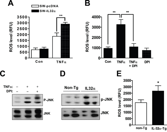 Figure 4: Effects of IL-32α on ROS release and JNK activation in cancer tissues and colon cancer cells. (A) Cells were treated with 30 ng/ml TNFα for 4 hr in SW-pcDNA cells and SW-IL-32α cells. *Significant difference from SW-pcDNA cells (**p < 0.01). (B) SW-IL-32α cells were treated with TNFα for 4 hr in the absence or presence of the NOX inhibitor, DPI (20 μM) for 30 min. ROS levels were determined using ROS detection kit as described in Materials and Methods section. *Significant difference from control or TNFα-treated cell (**p < 0.01). (C) After SW-IL-32α cells were treated with TNFα for 60 min in the absence or presence of DPI (20 μM) for 30 min, cell extracts were analyzed by Western blotting using anti-phospho-JNK and anti-JNK antibodies. (D, E) Cancer extracts were analyzed by Western blotting (D) and ROS detection kit (E) as described in Materials and Methods section. *Significant difference from non-Tg mice (**p < 0.01). Representative results shown in Figure 4 were repeated in triplicate with similar results.
