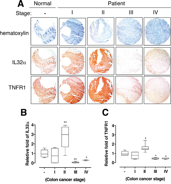 To further determine the pathological relevance between IL-32α and TNFR1 expression in colon tumor patients, we examined whether the expression of IL-32α was related with TNFR1 expression using application of human colon tumor tissue microarray. In immunohistochemical staining, there was a significant correlation between the IL-32α and TNFR1 (Figure 5A). Interestingly, IL-32α and TNFR1 expression were increased until stage II, whereas the expression was eventually decreased in stage III and IV in human colon tumor tissue when compared to normal colon tissues (Figure 5B and 5C). Thus, these data support the reliability that IL-32α and TNFR1 may dynamically play a role in the development of human colon cancer.