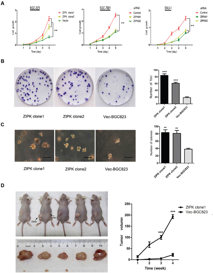 To characterize the biological effect of ZIPK on cell growth and proliferation in gastric cancer cell lines, ZIPK was stably transfected into BGC-823 cells (ZIPK clone1 or ZIPK clone2). Empty vector–transfected cells were used as control (Vec-BGC823). Meanwhile, ZIPK in SGC-7901 and SNU-1 cells were silenced by siRNAs. Ectopic overexpression and decreased expression of ZIPK were determined by RT-PCR and Western blotting (Supplementary Figure 1). XTT assays showed that ZIPK overexpression markedly increased BGC-823 cell proliferation. Conversely, silencing ZIPK inhibited cell proliferation in SGC-7901 and SNU-1 cells (P < 0.01 Figure 1A). Anchorage-dependent foci formation and anchorage-independent colony formation in soft agar yielded a higher number and larger colonies (P < 0.01) in the ZIPK-transfected cells compared to the control cells (Figure 1B, 1C). The tumorigenic potential of ZIPK was also evaluated by xenograft tumor formation in athymic nude mice. Subcutaneous visible tumors were observed in the left flank (ZIPK clone1) in all 5 tested animals on day 7 after injection. However, visible tumor in the right flank (Vec-BGC823) was only observed in 2 nude mice on day 14. Xenograft tumor growth curve indicated that tumors induced by ZIPK-transfeced cells grew much more rapidly than tumors induced by Vec-BGC823 cells (P < 0.001; Figure 1D). On day 28 after injection, tested mice were sacrificed and the tumors were excised for further analysis. The average volume of tumors induced by ZIPK clone cells (186 ± 48.8 mm3) was significantly increased compared with tumors induced by Vec-BGC823 cells (8.8 ± 10.5 mm3, P < 0.001; Figure 1D).