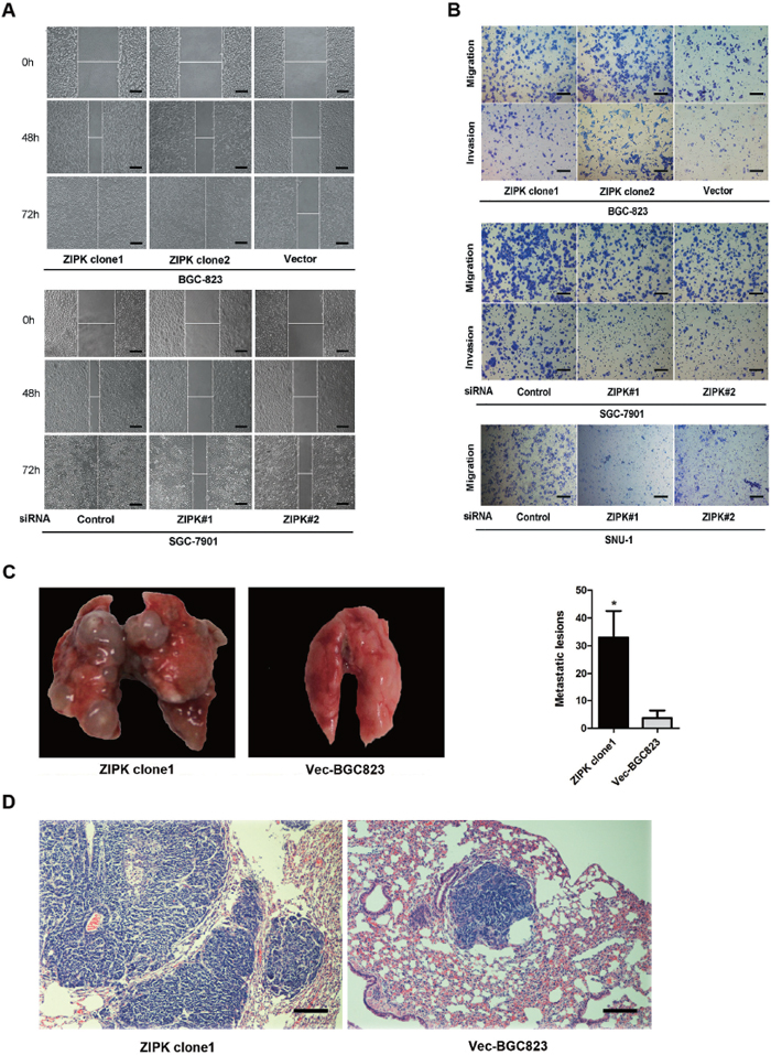Figure 2: ZIPK promotes cell invasion and gastric cancer metastasis. (A) Wound-healing assay showed that over-expression of ZIPK promoted cell migration. Silencing ZIPK inhibited cell migration (Scale bars: 100 μm). Representative images were taken at 0 h, 48 h and 72 h after scratching. (B) Transwell assay indicated that over-expression of ZIPK promoted cell migration and invasion. Inversely, ZIPK ablation repressed cell migration and invasion (Scale bars: 100 μm). (C) The effects of ZIPK on tumor metastasis in vivo were evaluated by tail vein injections of cells in nude mice. Representative images of lungs derived from nude mice injected with ZIPK- or empty vector-transfected BGC823 cells were shown in the left panel. Number of visible surface metastatic lesions was indicated in the right panel (*indicates P < 0.05, independent Student’s t-test). (D) Lung metastases in the mice were confirmed by H&E staining (Scale bars: 100 μm).