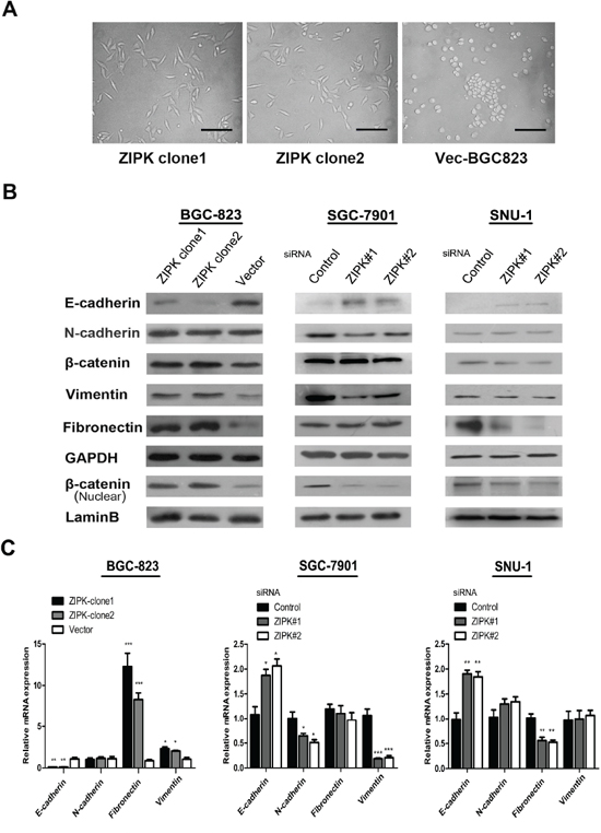 Figure 3: ZIPK induces epithelial-mesenchymal transition. (A) Effect of ZIPK over-expression on cell morphology evaluated by phase-contrast microscopy (Scale bars: 100 μm). (B) Expression of epithelial cell marker (E-cadherin), mesenchymal cell markers (vimentin, fironectin and N-cadherin) and β-catenin were examined by Western blot analysis in ZIPK-overexpressed, ZIPK-silenced and their respective control cells. GAPDH was used as a loading control. Intensities of bands were analyzed by the Macintosh densitometry program Image J (NIH, Bethesda, MD). (C) Relative expressions of E-cadherin, N-cadherin, vimentin, fibronectin, β-catenin were detected by qPCR in ZIPK-overexpressed, ZIPK-silenced and their respective control cells.