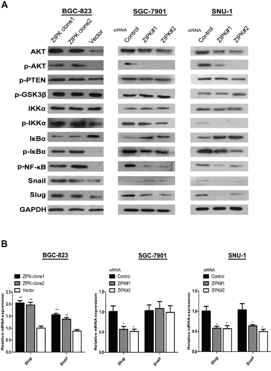 Figure 4: ZIPK activates AKT/IκBα/NF-κB pathway to induce EMT. (A) Western blot analysis showed the protein levels of AKT, pAKT, pPTEN, pGSK3β, IKKα, p-IKKα, IκBα, p-IκBα, p-NF-κB, Snail and Slug in ZIPK-overexpressed, ZIPK-silenced and their respective control cells. (B) Relative mRNA expression of Snail and Slug were detected by qPCR in ZIPK-overexpressed, ZIPK-silenced and their respective control cells.