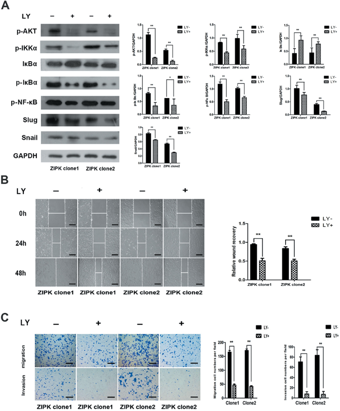 Figure 5: The AKT inhibitor LY294002 decreases ZIPK-induced cell migration and invasion. (A) ZIPK-overexpressed cells were treated with LY294002 (20 μM) or DMSO for 2 h, the expressions of pAKT, IKKα, p-IKKα, IκBα, p-IκBα, p-NF-κB, Snail and Slug were detected by Western blotting. (B) Wound-healing assay showed that LY294002 strongly inhibited cell migration (**indicates P < 0.01, independent Student’s t-test, scale bars: 100). (C) Transwell assay indicated that LY294002 reduced ZIPK-induced cell migration and invasion (**indicates P < 0.01, independent Student’s t-test, scale bars: 100).