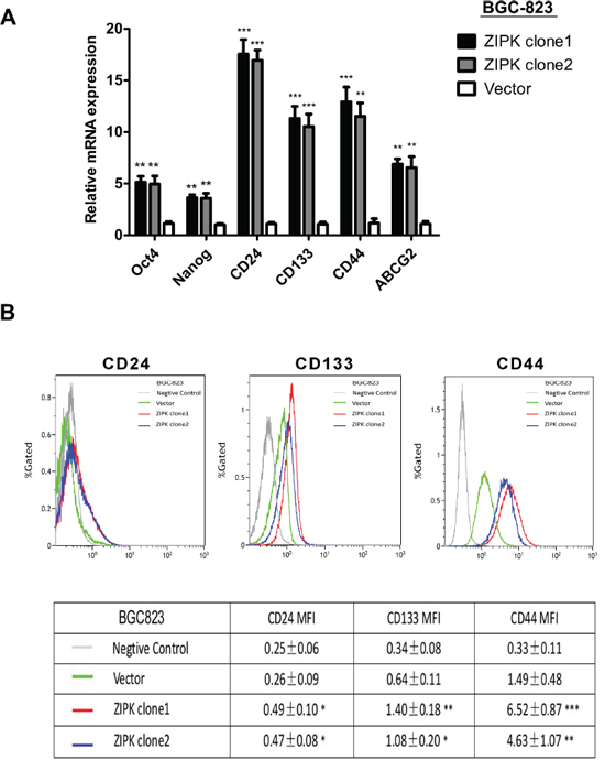 Figure 6: ZIPK enhances stemness of gastric cancer cells. (A) Quantitative real-time PCR analysis showed the elevated expression of Oct-4, Nanog, ABCG2, CD44, CD24 and CD133 in ZIPK-transfected cells compared with control cells (**indicates P < 0.01; ***indicates P < 0.001, independent Student’s t-test). (B) Flow cytometry analysis showed the higher mean flourscence indensity of FITC-CD44, PE-CD24, and PE-CD133 in ZIPK-transfected cells (**indicates P < 0.01, independent Student’s t-test).