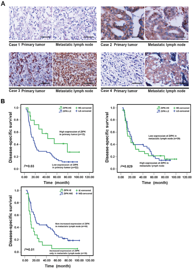 Figure 7: The prognostic significance of ZIPK expression in primary GCs and matched metastatic lymph nodes. (A) Immunohistochemical analysis of ZIPK expression in primary cancer tissues and matched lymph node metastases (200 × magnification, Scale bars: 100). Representative images in the upper panel illustrated that the levels of ZIPK expression were not different between primary and metastatic cancers. Images in the lower panel showed increased ZIPK expression in lymph node metastases compared to their primary tumors. (B) Kaplan–Meier survival analysis of ZIPK expression in total 67 gastric cancer patients. High expression of ZIPK in primary tumors was significantly associated with better disease specific survival rates of GC patients (upper left panel); increased ZIPK expression only in metastatic lymph nodes was correlated with poorer disease specific survival (low left panel). ZIPK-HE, ZIPK high expression; ZIPK-LE, ZIPK low expression; ZIPK-IE, ZIPK increased expression; ZIPK-NIE, ZIPK non increased expression.
