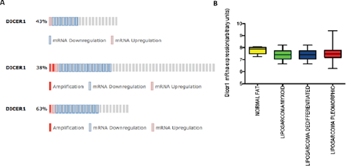 Figure 1: In silico analyses. (A) Dicer expression in three different Case Sets: MLPS/RLPS (21 samples), Dicer altered in 9 (43%); DDLPS (50 samples), Dicer altered in 19 (38%); PLPS (24 samples), Dicer altered in 15 (63%). (B) Dicer mRNA levels in different LPS histologies compared to normal fat. (p value > 0.05).