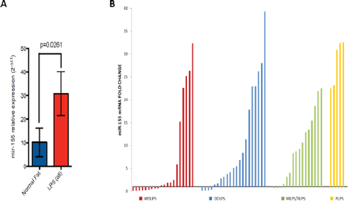 Our results showed a significant mir-155 up-regulation in all LPS subtypes taken together compared to normal fat (p = 0.0261) (Figure 3A).