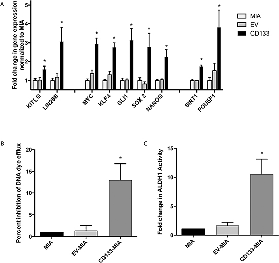 Figure 1: Expression of the cancer stem cell marker CD133 results in increased “stemness”. CD133 overexpression led to (A) increased gene expression of “stemness” genes as compared with vector control (B) increased dye efflux and (C) increased ALDH activity.