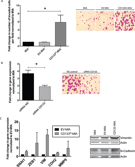 Figure 3: CD133 expression induces EMT and increases invasiveness in vitro. (A) In vitro Boyden chamber invasion of MIA, EV-MIA, CD133hi-MIA with representative images from the Boyden chamber invasion assay, (B) Invasion upon CD133 silencing in CD133hi-MIA with representative images, and (C) EMT gene expression in CD133hi-MIA as compared with EV-MIA control and protein expression of Vimentin and N-Cadherin.