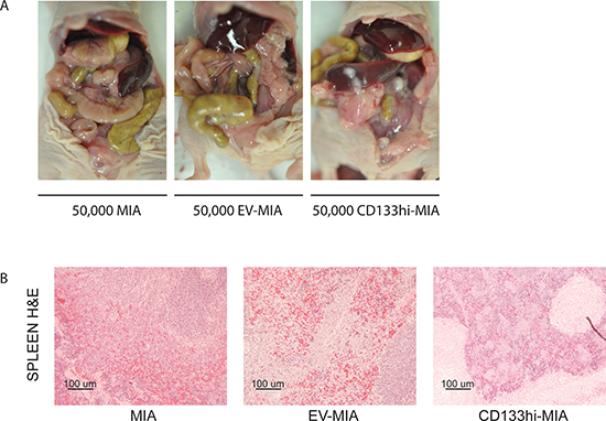 Figure 4: CD133 expression increased metastasis in vivo. (A) Representative images of metastatic spread within the abdomen after orthotopic implantation of MIA, EV-MIA, and CD133hi-MIA cells. (B) H&E –stained sections of the spleen.