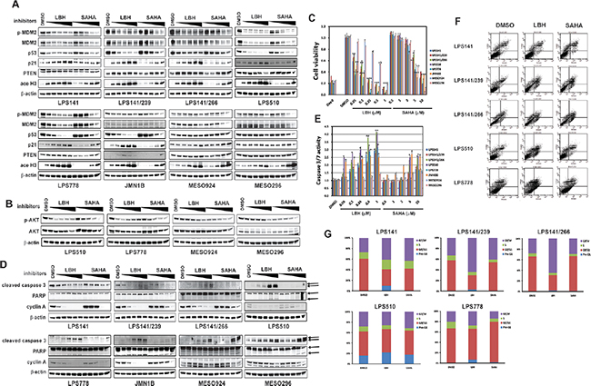 HDACi LBH589 and SAHA were evaluated by immunoblotting, apoptosis, proliferation, and cell cycle analyses (Figure 3A–3G). Treatment with HDACi LBH589 and SAHA induced expression of p21, PTEN, and acetyl-H3 in all LPS lines (Figure 3A), and inactivated AKT in LPS510, LPS778, MESO924, and MESO296 (Figure 3B) in a concentration-dependent manner. Treatment with HDACi resulted in degradation of mutant p53, and induction of p21, PTEN, and acetyl-H3, but had little effect on phosphorylation and expression of MDM2 in JMN1B. HDACi LBH589 and SAHA showed minimal effect on expression/phosphorylation of MDM2 and p53 in MESO924 and MESO296 (Figure 3A).