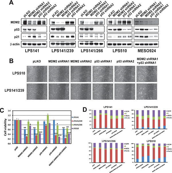 Figure 4: Additive effects were observed through coordinated knockdowns of MDM2 and TP53 as demonstrated by immunoblotting (A) cell culture appearance (B) cell viability (C) and cell cycle analyses (D) showing that MDM2 and TP53 knockdown had greater anti-proliferative effects and cell cycle arrest, compared to either intervention alone in MDM2-amplified and p53 mutant liposarcoma cell lines. (A) MDM2, p53, and p21 were evaluated by immunoblotting at 10 days post-infection with stable MDM2 and/or TP53 shRNA expression. Actin staining is a loading control. (B) Cell culture appearance in LPS141/239 and LPS510 at 10 days after infection by lentiviral MDM2 and/or TP53 shRNA constructs, showing greater growth inhibition compared to either intervention alone. (C) Cell viability evaluated by a Cell-titer Glo® ATP-based luminescence assay in liposarcoma cell lines (LPS141, LPS141/239, LPS141/266, and LPS510), at 72 hours following stable MDM2 and/or TP53 shRNA expression for 10 days. Data were normalized to the empty lentivirus infections or DMSO, and represent the mean values (± s.d.) from quadruplicate cultures. Statistically significant differences between empty vector control and target gene shRNAs are presented as *p < 0.05, **p < 0.01, ***p < 0.001. (D) Cell cycle analyses performed at 72 hours following stable lentiviral MDM2 and/or TP53 shRNA expression for 10 days.