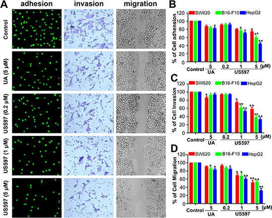 Figure 2: (A) The number of adherent HepG2 cells was photographed under the fluorescence microscope at × 200 magnification (left); b, phase micrograph of invading HepG2 cells were treated with UA or US597 (middle); c, phase micrographs of HepG2 cells were treated with UA or US597 at 24 h after monolayer wounding (right). (B) Quantitative analysis of the inhibition by UA/US597 on the adhesion of SW620, B16-F10 and HepG2 to HUVECs. (C) Cells invaded through the membrane were quantified. (D) Migrated cells were quantified by manual counting. Data are obtained from 3 separate experiments and bars represent the mean ± SD. * indicates P < 0.05 and ** means P < 0.01.