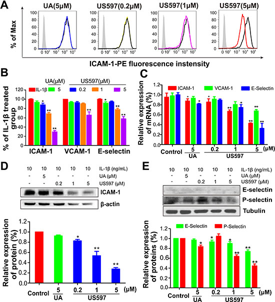 Figure 3: (A) Expression of ICAM-1 on HUVECs determined by flow cytometry, and (B) the inhibitory effect of UA/US597 on the expression of ICAM-1, VCAM-1 and E-selectin, silver area is an isotype control, blank curve as a control, blue curve represents UA (5 μM) treated group, yellow, purple and red line represents US597 treated group at concentrations of 0.2, 1 and 5 μM, respectively. (C) Quantitative real-time PCR assay of the inhibitory effect of UA/US597 on the mRNA expression of ICAM-1, VCAM-1 and E-selectin. The expression of ICAM-1 (D), E-selectin and P-selectin (E) on HUVECs were analyzed by Western blotting. Data were expressed as the percentage of control. Bars represent the mean ± SD (n = 3); *P < 0.05 and **P < 0.01.