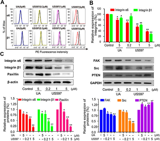 Figure 5: Flow cytometric analysis was performed for integrin α6 and β1 (A) on HepG2 cells, and (B) The inhibitory effect of UA/US597 on the expression of integrin α6 and β1, isotype control (silver area), control (blank curve), blue curve (5 μM UA), yellow, purple and red line represents US597 treated group at concentrations of 0.2, 1 and 5 μM, respectively. (C) Western blotting analysis of UA/US597 on the down-regulation of integrin α6β1 and its downstream signaling regulator (FAK, Src, paxillin and PTEN) expression in HepG2 cells. Data were obtained from 3 separate experiments and were mean ± SD. (*P < 0.05, **P < 0.01 in comparison with control).