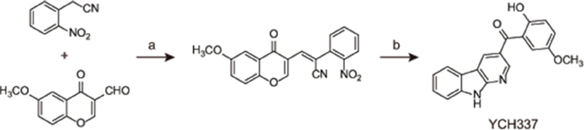 Figure 1: The chemical structure and synthesis of YCH337. Reagents and conditions used in the preparation of YCH337: (a) NaOAc, AcOAc, 90°C, 85%; (b) Fe, AcOH, reflux 2 h, 55%.
