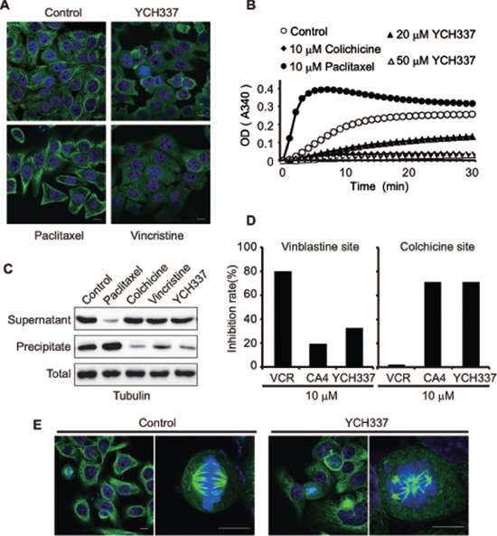 Figure 2: YCH337 inhibits microtubule polymerization by binding to the colchicine site and disrupts spindle assembly. (A) HeLa cells were treated with YCH337, vincristine or paclitaxel at 0.5 μM for 1 h and then interphase microtubule was imaged by immunofluorescence microscopy. Scale bar: 10 μm. (B) YCH337 inhibited in vitro polymerization of microtubulin in a cell-free system. Colchicine and paclitaxel were used as references. (C) SK-OV-3 cells were treated with different agents at 0.2 μM for 24 h. Then, the polymerized fraction and the free fraction of tubulin were separated by ultracentrifugation and processed for Western blotting. (D) the binding site of YCH337 on tubulin was determined by the competitive binding assay. Vincristine and CA4 were used as references. (E) HeLa cells were treated with 1 μM YCH337 for 1 h, and then the mitotic spindle assembly was shown by immunofluorescence microscopy. Scale bar: 10 μm.
