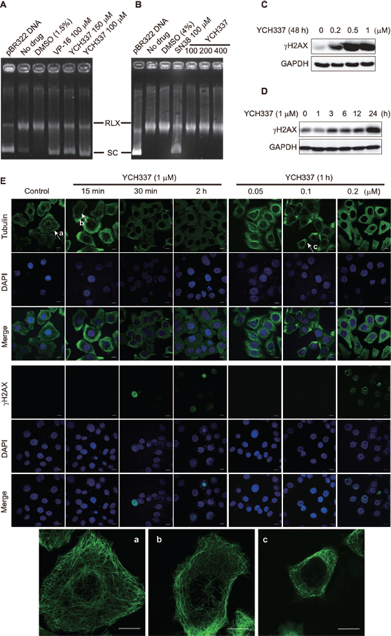 Figure 3: YCH337 inhibits Top2, which is weaker than it suppresses microtubule in cells. (A–B) YCH337 inhibited DNA decatenation catalyzed by Top2 (A) rather than by Top1 (B). The electrophoresis assay was described in Materials and methods. Each reaction contained the same amount of Top2 (A) or Top1 (B) and DMSO except the control (pBR322 DNA). The Top2 inhibitor etoposide (VP-16) and the Top1 inhibitor SN38 were used as positive controls. RLX: the relaxed form of pBR322 DNA. SC: the supercoiled form of pBR322 DNA. (C–D) HeLa cells were treated with YCH337 at indicated concentrations for 48 h (C) or at 1 μM for the indicated time (D). Then the cells were lyzed and immunoblotted for γH2AX. (E) HeLa cells were treated with YCH337. Tubulin and γH2AX foci were then imaged by the immunofluorescence-based laser confocal microscopy. The magnified images of microtubule in the cells pointed to by the arrows (a, b and c) were presented at the bottom of the figure. Scale bar: 10 μm.