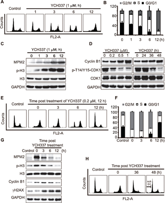 Figure 4: YCH337 induces reversible mitotic arrest but irreversible DNA damage. (A–C) HeLa cells were treated with 1 μM YCH337 for the indicated time. Cell cycle was analyzed by flow cytometry (A). The statistical data of three independent experiments were shown in (B). The cells were treated with 1 μM YCH337 for the indicated time, and then the cells were lyzed and immunoblotted for mitotic molecular markers MPM2 and p-H3 (Ser10-phosphorylated histone 3) (C). (D) HeLa cells were treated with YCH337 at 0.5 μM for the indicated time or at indicated concentrations for 48 h. Then, the cells were lyzed and immunoblotted for CyclinB1 and phosphorylated CDK1 at Thr14/Tyr15 (p-T14/Y15-CDK1). (E–F) HeLa cells were treated with 0.2 μM YCH337 for 12 h. Then the medium was changed to remove YCH337 and the cells continued to be cultured in the drug-free medium for indicated time for flow cytometry analysis (E). The statistical data of three independent experiments were shown in (F). (G–H) HeLa cells were treated as in (E) and collected for Western blotting (G) or flow cytometry analysis (H).