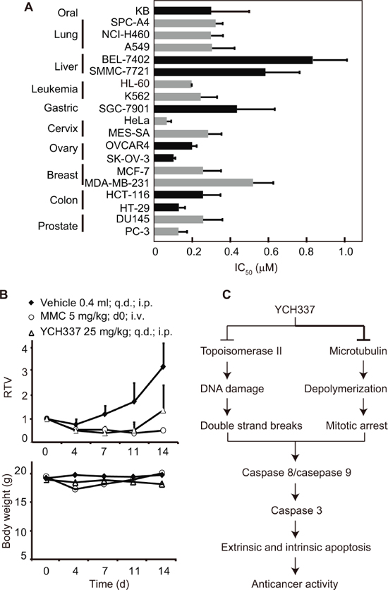 Figure 6: YCH337 inhibits proliferation and growth of human tumor cells in vitro and in vivo. (A) YCH337 exerted potent antiproliferative activity on a panel of cancer cell lines. SRB assays (for solid tumor cells) or luminescent cell viability assays (for leukemia cells) were used to determine the 72-h IC50 values. Data from three independent experiments were expressed as mean ± SD. (B) YCH337 affected the growth of human colon cancer HT-29 xenografts in nude mice (upper) and the body weight of the tested animals (lower). Vehicle, 0.5% carboxymethylcellulose sodium; MMC, mitomycin C; RTV, relative tumor volume. There is statistically significant difference of RTV between the vehicle and YCH337 treatment groups beginning on day 7, P < 0.005. (C) a schematic presentation of possible mechanisms of action of YCH337.