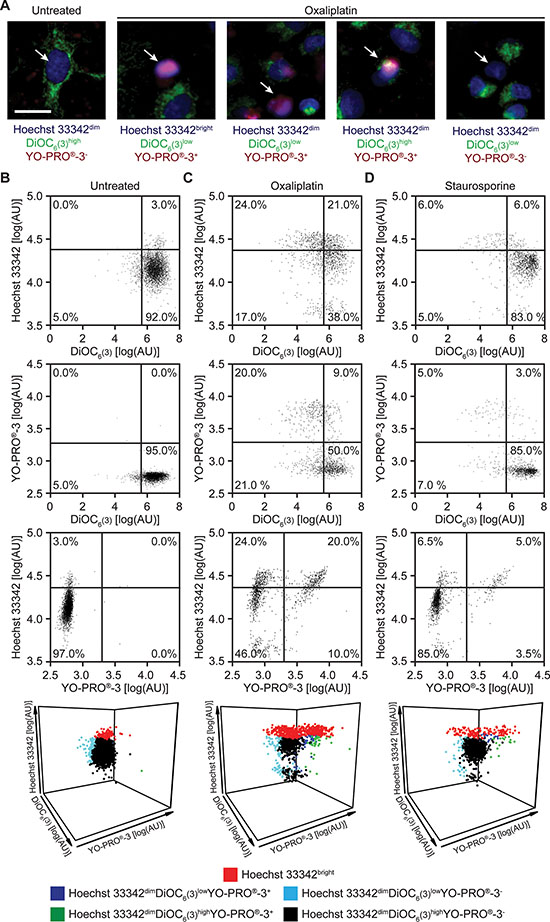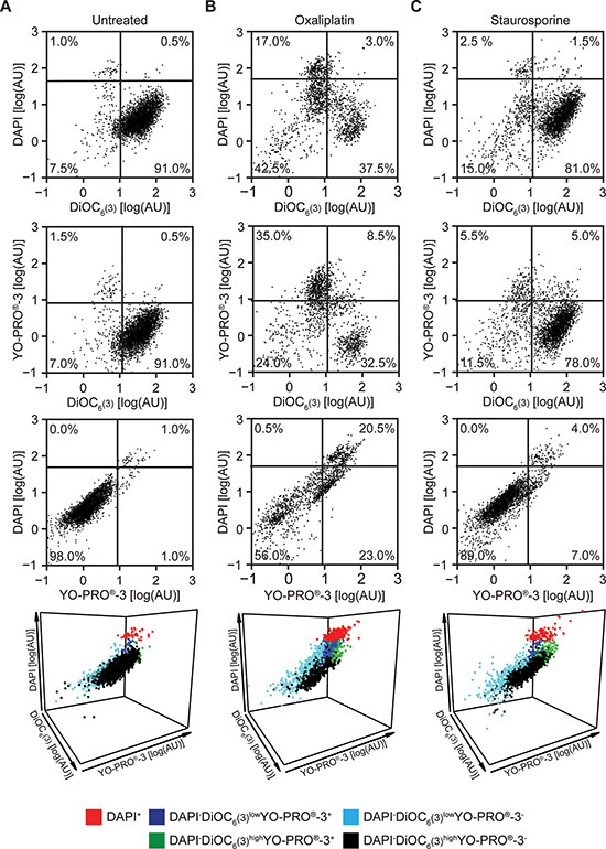 Figure 2: Flow cytometry-based assessment of cellular viability to standard inducers of apoptosis. (A–C) Human non-small cell lung carcinoma A549 cells were cultured in control conditions or treated with 500 μM oxaliplatin or 4 μM staurosporine for 24 hrs, then co-stained with DAPI, DiOC6(3) and YO-PRO®-3 and analyzed by flow cytometry. Representative dot plots are reported. In panels A, B and C, numbers indicate the percentage of events within each gate. See also Supplementary Figure 2.
