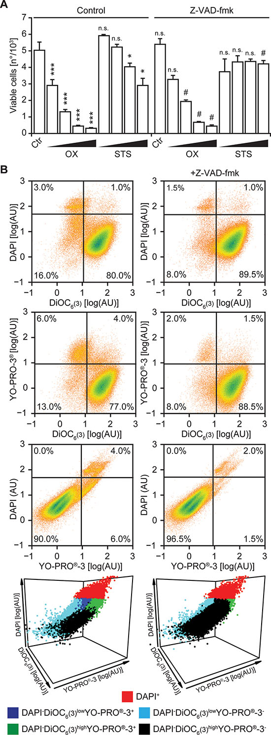 Figure 3: Flow cytometry-based assessment of cell death modulation. (A–B) Human non-small cell lung carcinoma A549 cells were maintained in control conditions (Ctr) or incubated with increasing concentrations of staurosporine (STS; 0.5 –1.0 – 2.0 – 4.0 μM), oxaliplatin (OX; 0.125–0.250–0.500–1 mM) and 50 μM Z-VAD-fmk, alone or in combination for 24 hrs. Thereafter, cells co-stained with DAPI, DiOC6(3) and YO-PRO®-3 and analyzed by flow cytometry. In panel (A) quantitative data on the absolute number of DAPI−DiOC6(3)highYO-PRO®-3− (viable) cells are reported (means ± SD, n = 3 replicate assessments from one representative experiment; *p < 0.05, ***p < 0.001, as compared to untreated cells; #p < 0.05, as compared to cells maintained in the same conditions in the absence of Z-VAD-fmk; n.s., non-significant, as compared to untreated cells or cells maintained in the same conditions in the absence of Z-VAD-fmk). In panel (B) dot plots depict the aggregate analysis of cells maintained in control conditions and exposed to 4 μM STS or 500 μM OX, alone (left panels, upon pooling data from 3 distinct samples) or in the presence of Z-VAD.fmk (right panels, upon pooling data from 3 distinct samples). Numbers indicate the percentage of events within each gate.