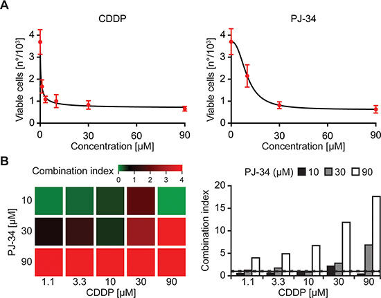 Figure 4: Flow cytometry-based assessment of pharmacological interactions. (A, B) Human non-small cell lung carcinoma A549 cells were left untreated or treated with the indicated concentrations of cisplatin (CDDP) or PJ-34 for 48 hrs, then stained with DAPI, DiOC6(3) and YO-PRO®-3 and analyzed by flow cytometry. Panel A reports quantitative data on DAPI−DiOC6(3)highYO-PRO®-3− (viable) cells (means ± SD, n = 3 replicate assessments from one representative experiment), while panel B illustrates combination indexes (CIs) calculated according the Harbron’s method. Please note that CIs < 0.8 (green on the heatmap) and > 1.2 (red on the heatmap) represent synergistic and antagonistic interactions, respectively.