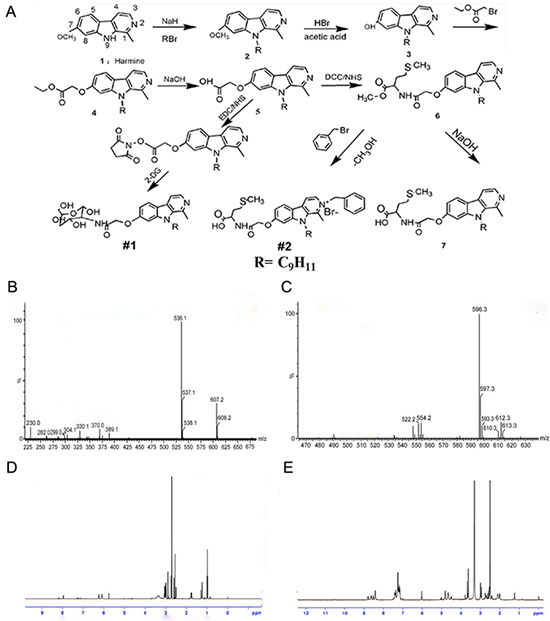 Figure 1: A. synthetic scheme of harmine derivatives 2DG-Har-01 and MET-Har-02. B. and C. Mass spectrums of 2DG-Har-01 (B) and MET-Har-02 (C) D. and E. 1H-NMR spectrums of 2DG-Har-01 (D) and MET-Har-02 (E).