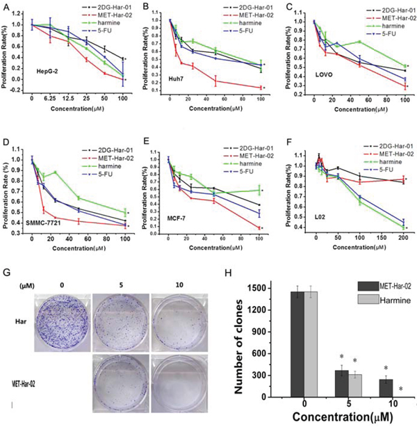 Figure 2: (A–F) In vitro antitumor efficacy and cytotoxicity of 2DG-Har-01 and MET-Har-02. Tumor cell proliferation rate of HepG-2 cells A. Huh7 cells B. LOVO cells C. SMMC-7721 cells D. MCF-7 cells E. and normal liver cell L02 F. incubated with either 2DG-Har-01, MET-Har-02, harmine or 5-FU. G. and H. Clone formation assay was performed on HepG2 cells. The cells incubated with either harmine (Har) or MET-Har-02 with different concentration (0, 5 10 μM). Data are given as mean ± SD (n = 5). *P < 0.05.
