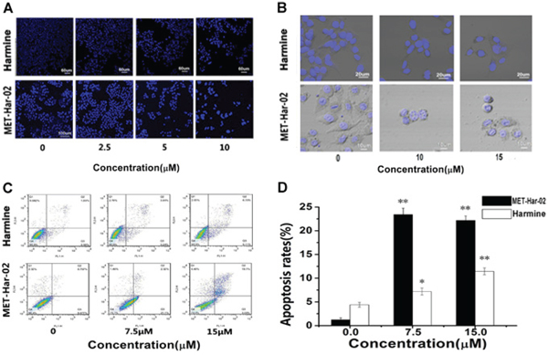 Further studies were carried out to seek the potential processes governing the anti-tumor effect of MET-Har-02 and harmine. Since many anticancer drugs cause the death of tumor cells through the induction of apoptosis, we thus assume that MET-Har-02 promotes cancer cell apoptosis. This hypothesis was tested using HepG2 cell line. As expected, the treatment of MET-Har-02 and harmine both decreased the survival of HepG2 Cells (stained with hoechst) and the cell survival rates were decreased with increasing the compounds concentrations (from 0 to 10 μM) (Fig. 3A). It also suggested that the antitumor activity of MET-Har-02 is better than the hamrine’s (the amounts of the cells in the same concentration).