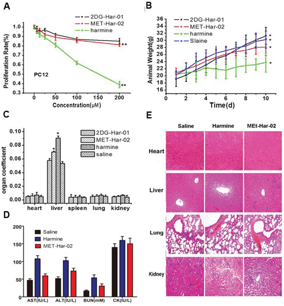Figure 5: The neurotoxic and acute toxicities of 2DG-Har-01 and MET-Har-02 on healthy mice. A. the proliferation rate of the mice neural cells PC12 incubated with 2DG-Har-01, MET-Har-02 and harmine. Data are given as mean ± SD (n = 10). **P < 0.01. B. animal weights of normal mice in different groups (2DG-Har-01, MET-Har-02, harmine and saline). C. organ coefficient (organ weight/animal weight) of normal mice in different groups (2DG-Har-01, MET-Har-02, harmine and saline) on the 10th day. D. the blood serum index (AST, ALT, BUN, CK) of the mice after the acute toxicities test. E. The histology examination on main organ of different mice group (MET-Har-02, harmine and saline treated).