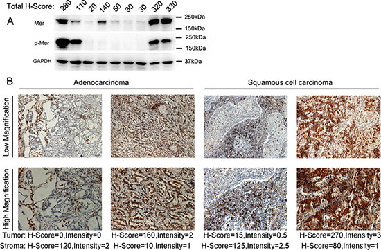 Figure 2: Overexpression of Mer RTK in NSCLC of freshly harvested cancer tissues. A. Evaluation of Mer expression and activation (phosphorylated Mer, p-Mer) in lysates of 9 freshly harvested NSCLC tissues by western blotting. The corresponding H-score of each sample evaluated by IHC is listed on the top of each lane. B. Immunohistochemical staining of Mer in sections of freshly harvested NSCLC tissues with representative pictures of adenocarcinoma (left) and squamous cell carcinoma (right). The scale bars in the pictures of low and high magnification represent 50 μM and 100 μM respectively.